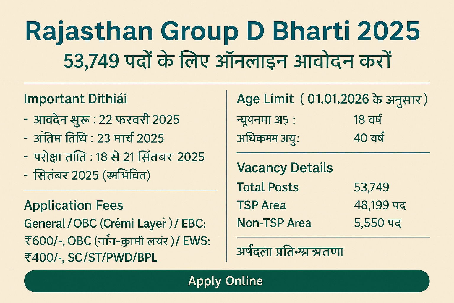 Rajasthan Staff Selection Board (RSSB) has released the Rajasthan Group D Recruitment 2025 (राजस्थान ग्रुप डी भर्ती 2025) notification for 53,749 पदों. This is a golden opportunity for 10th pass candidates (10th Pass Sarkari Naukri) looking for a government job (Sarkari Naukri 2025). Interested candidates can apply online (Rajasthan Group D Online Form 2025) from 22nd February to 23rd March 2025 on the official website.